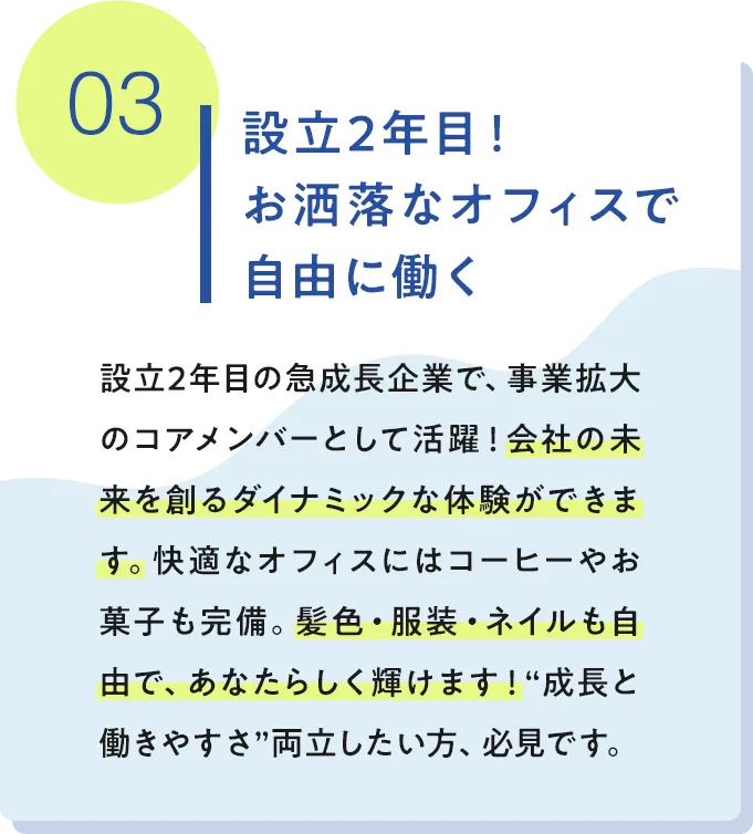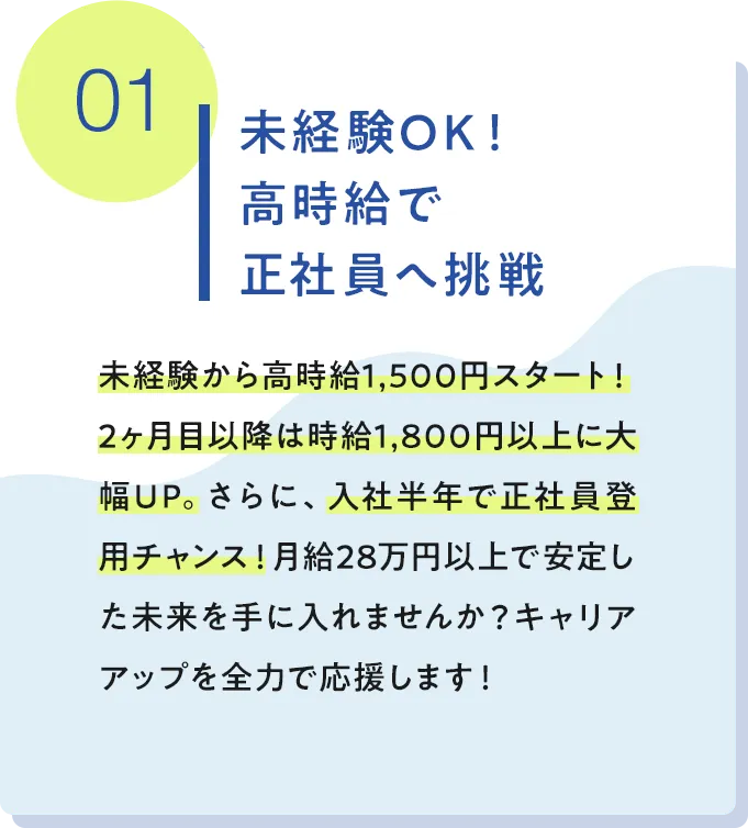 職種 バックオフィス(事務) 雇用形態 パート・アルバイト正社員 ※試用期間1ヶ月 給与 時給:1500円〜*2ヶ月目からは1800円に昇給!正社員月給:28万円〜 店舗名・勤務地 〒103-0027東京都中央区日本橋1-13-1 日鉄日本橋ビル3階日本橋駅直結オフィスで通勤ラクラク🎶 勤務時間 ・月水:11:00〜20:00(実働8h/休憩1h)・火木金:9:00〜18:00(実働8h/休憩1h)勤務時間相談可能♪お子様がいない時間帯のみの時短勤務など 休日 ・完全週休二日制(土・日)・祝日・年末年始休暇(2024年実績:9日)・有給休暇・慶弔休暇・年間休日120日以上 仕事内容 ・データ入力、管理、書類作成、ファイリング・請求書発行・管理、発注書の作成・処理・電話、メール対応・その他、事務全般のサポート業務・現地調査など最初はサポート的な役割からスタートし、徐々にメイン担当をお任せする予定です! 必要経験 基本的なPCスキルのみでOK! 必要資格 普通自動車運転免許をお持ちであれば尚可 福利厚生 ・各種保険・交通費支給・資格取得支援制度*業務に関するもの・髪色、服装、ネイルOK(オフィスカジュアル)・ボクシング観戦あり(ボクシング選手のスポンサーをしています!)・キレイなオフィス(コーヒーメーカー・紅茶・お菓子・軽食あり) 公式サイト